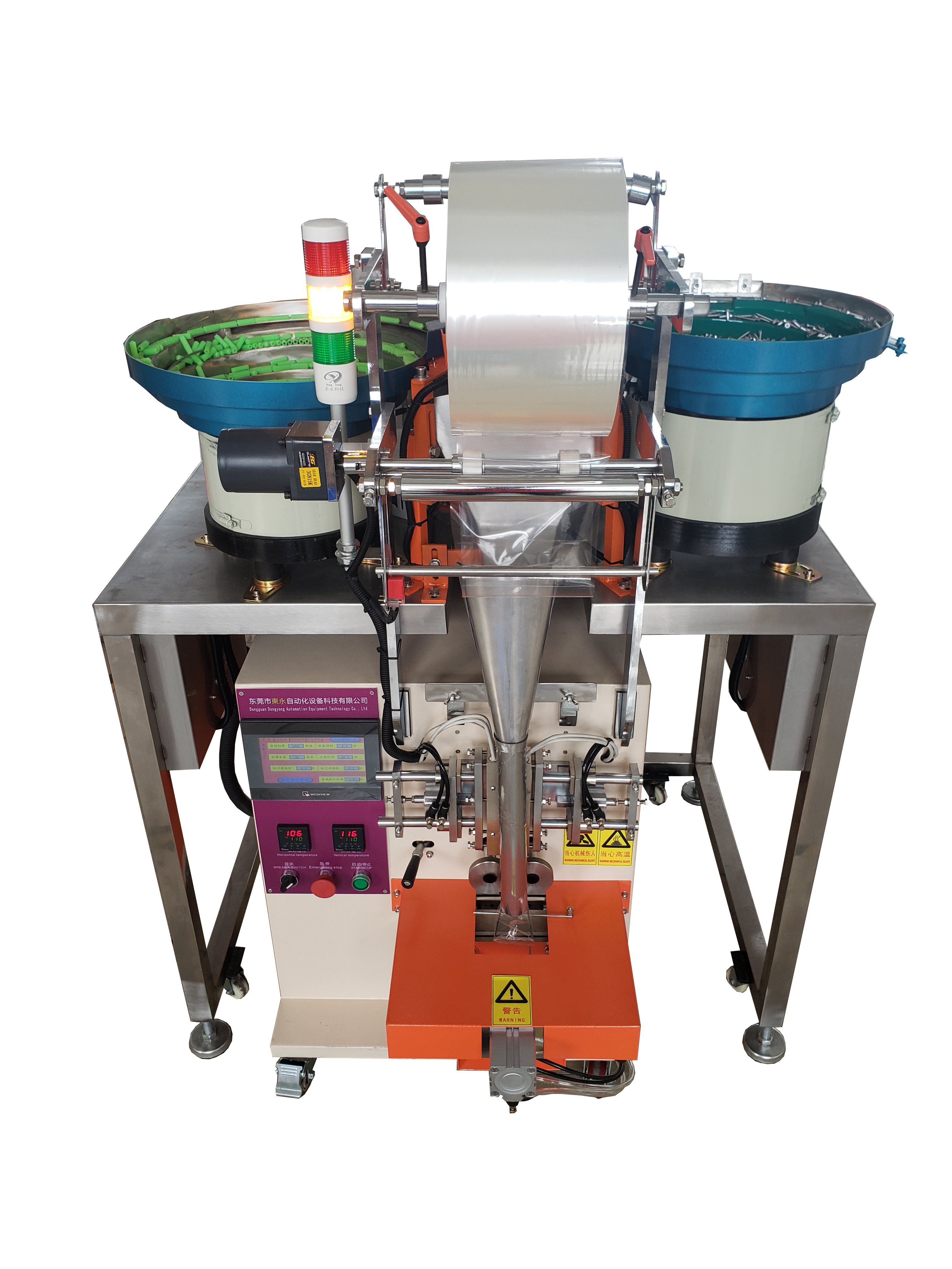 可帶多個振動盤,目前是20套振動盤,可(kě)同時將多種不同的物料包裝到包裝袋內,您也可以選擇性地用其中的(de)一個、兩個、三個或四個振動(dòng)盤(即單(dān)款單獨包裝、2款混合包裝、3款混合包裝、4款混合包裝);廣泛應(yīng)用於家具(jù)、衛浴、鎖業、電工、電(diàn)器、燈飾、五金建材等製造(zào)工業的附屬安裝螺絲、五金配件。